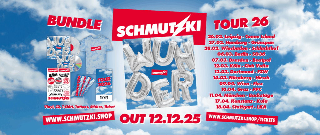 Mit ihrem neuen Album „WUNDER“ (VÖ: 12.12.2025) starten Schmutzki in die nächste Runde. Sie liefern 7 brandneue Songs voller Chaos, Energie und Herzblut – eine rotzige Mischung aus Punkrock, Freundschaft und Mitsing-Hymnen, die live noch mehr zünden. Ob Festivalbühne oder Clubshow – wo Schmutzki auftauchen, brennt sofort das Dach.